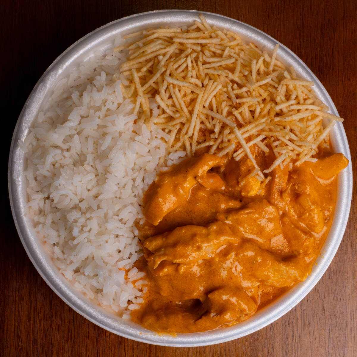 Strogonoff de Carne ou Frango (a sua escolha), Arroz soltinho, Feijão (opcional), Batata Palha (550g)