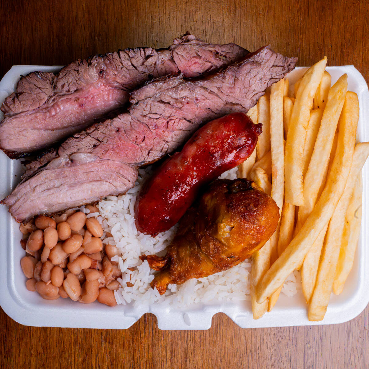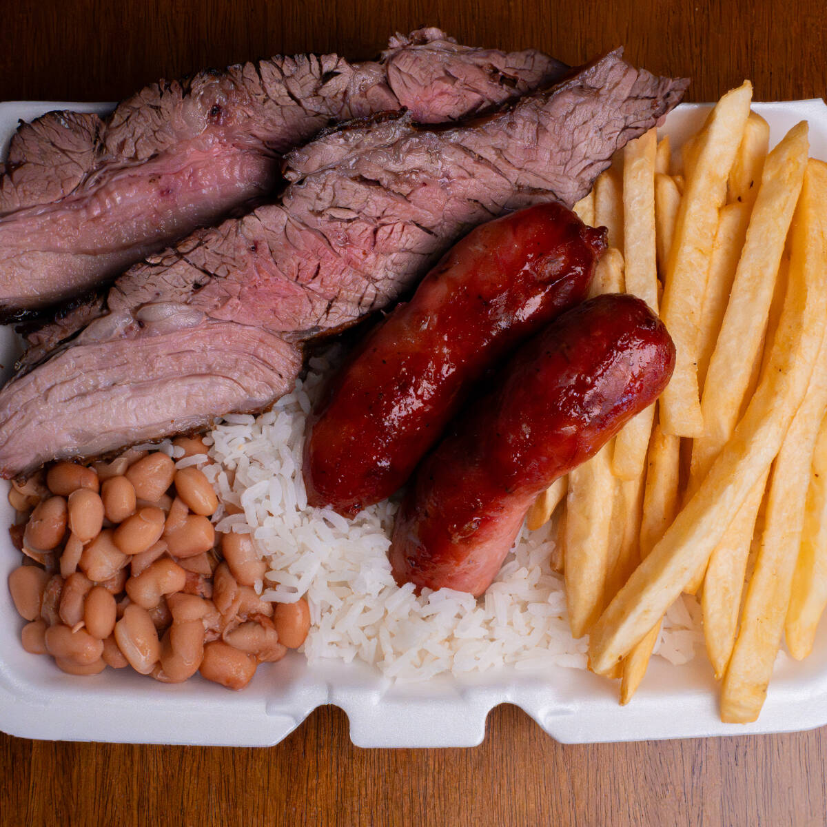 Fraldinha e Linguiça assados na brasa com Arroz soltinho, Feijão bem temperado e Fritas (800g)