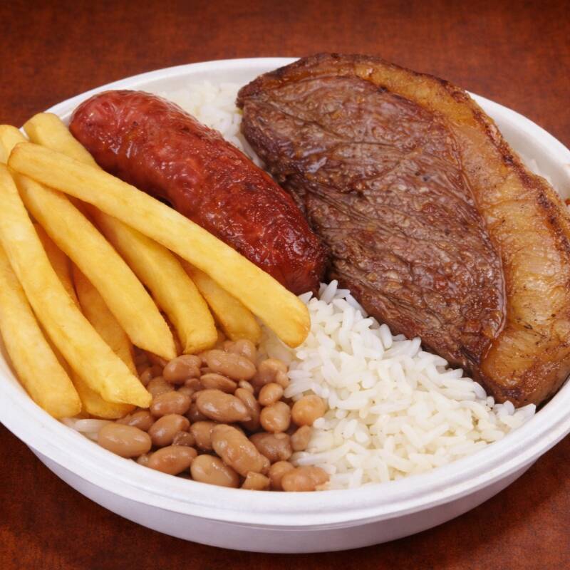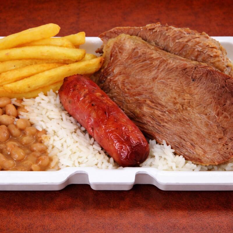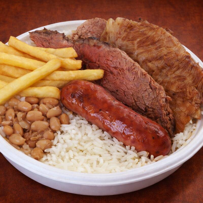 Três bifes de Picanha, Arroz soltinho, Feijão, Fritas, Farofa e Salada (tomate, alface e cebola)