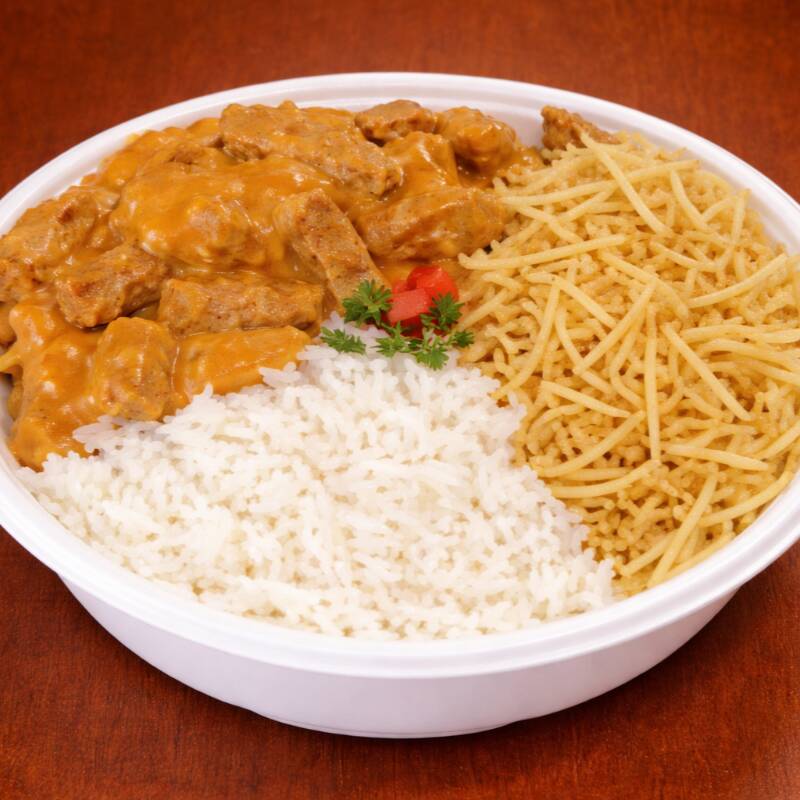 Strogonoff de Frango , Arroz soltinho, Feijão (opcional), Batata Palha