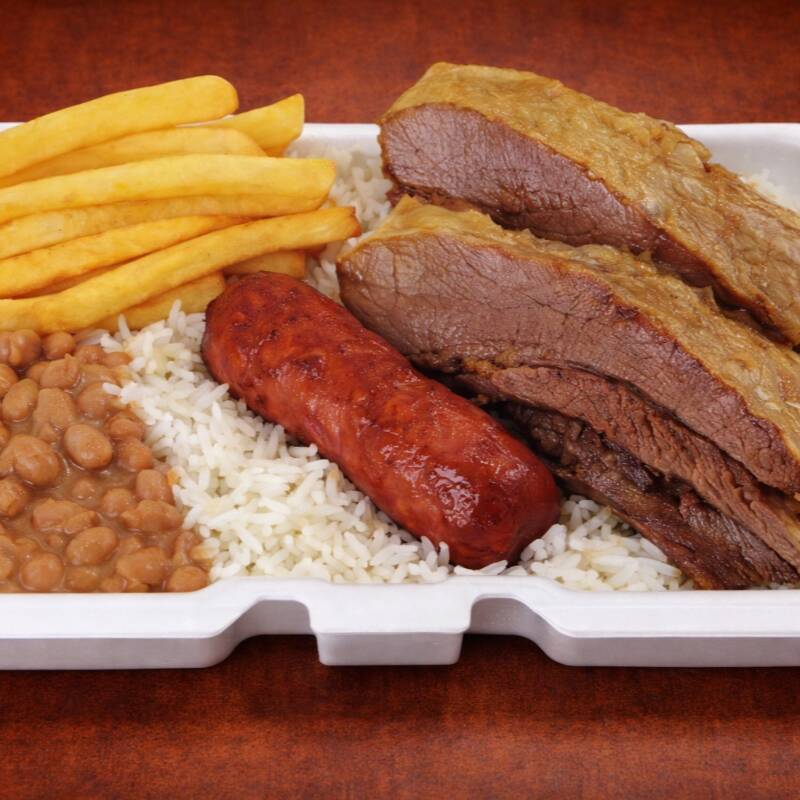 Costela, 1 linguiça, com Arroz soltinho, Feijão bem temperado e Fritas (800g)