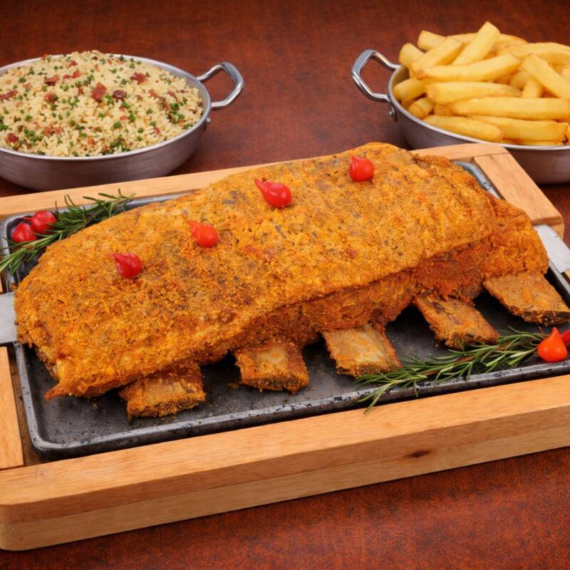 Costela Bovina Casqueirada, Arroz de sua escolha (Carreteiro, Biro Biro, À Grega ou Branco), Vinagrete, Fritas e Farofa
