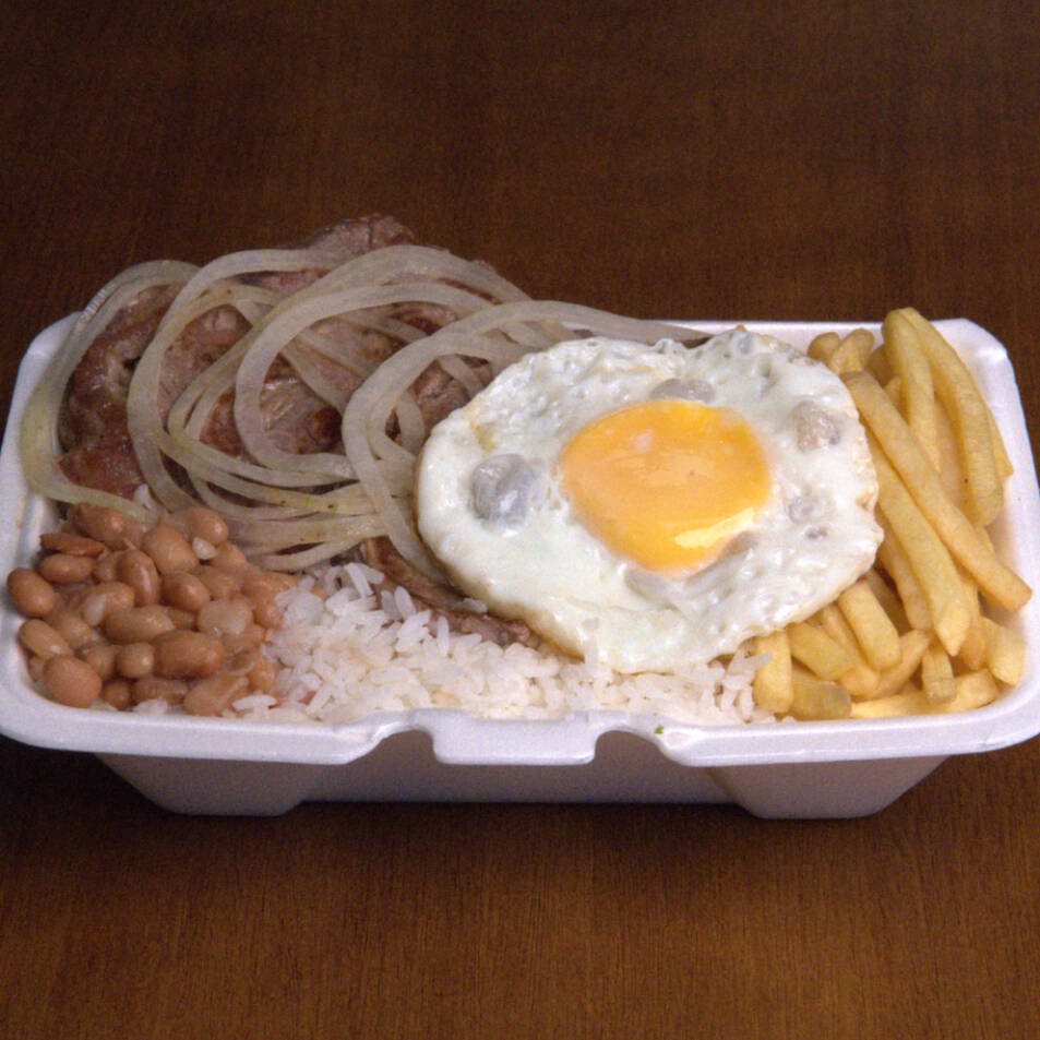 Bife Acebolado com Ovo, Arroz soltinho, Feijão bem temperado e Fritas (800g)