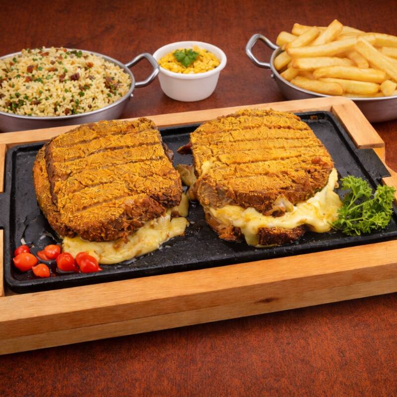 2 Cupim Casqueirado recheado com queijo , Arroz de sua escolha (Carreteiro, Biro Biro, À Grega ou Branco), Vinagrete, Fritas e Farofa