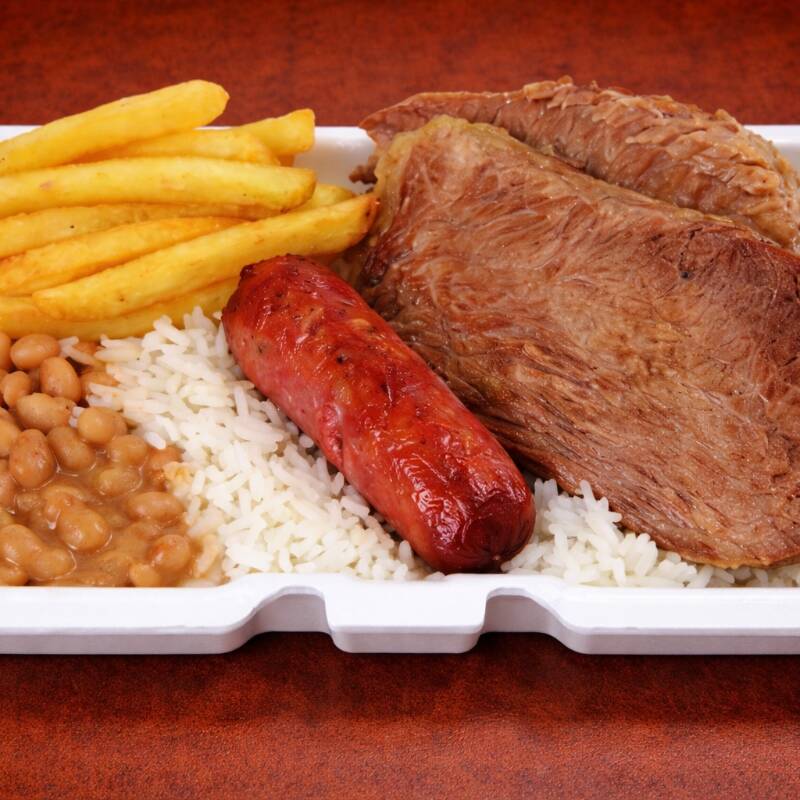 Filé de Frango feito na chapa, Linguiça assada na brasa, Ovo frito, Arroz soltinho, Feijão bem temperado e Fritas