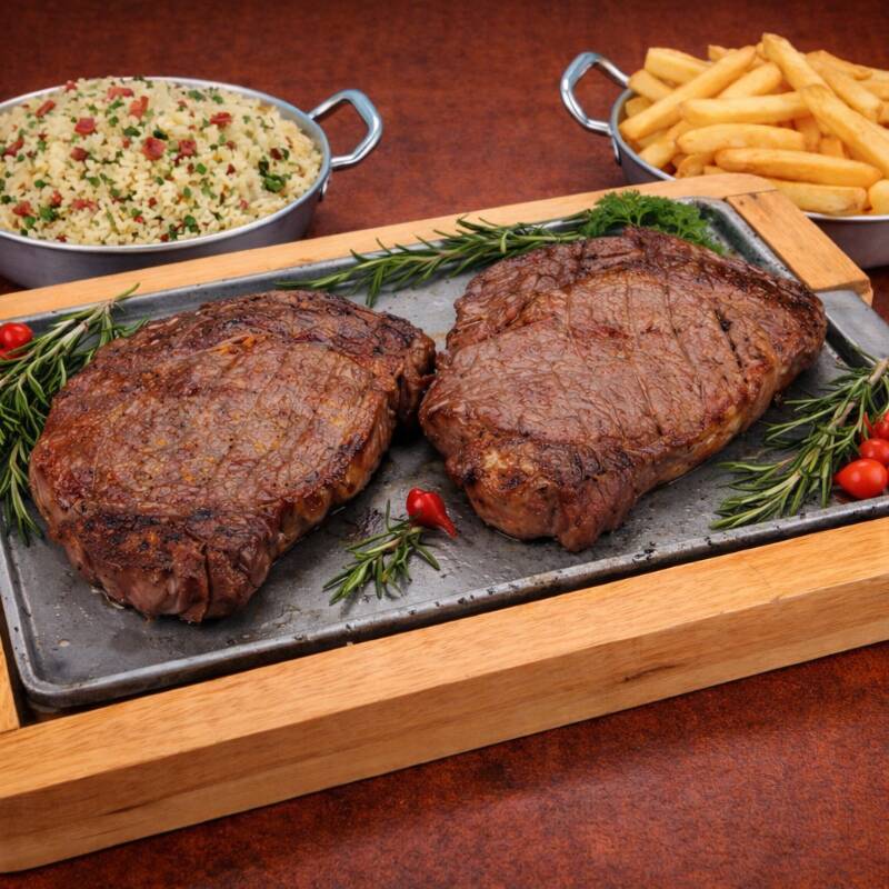 2 Bife de Chorizo Grande , Arroz de sua escolha (Carreteiro, Biro Biro, À Grega ou Branco), Vinagrete, Fritas e Farofa