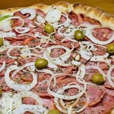 Deliciosa pizza com fatias de calabresa, cebola roxa e azeitonas pretas.