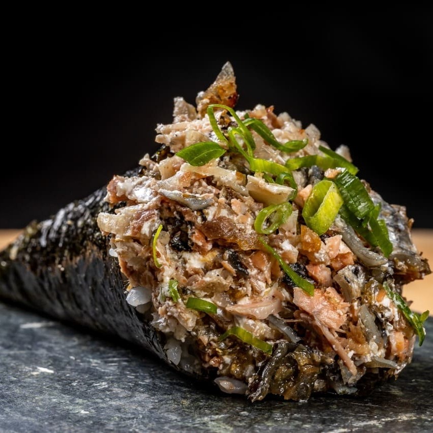 Tradicional kone enrolado com alga marinha + shari + recheio de salmão grelhado, empanado e frito, cebolinha, creem cheese, gergelim e tarê.