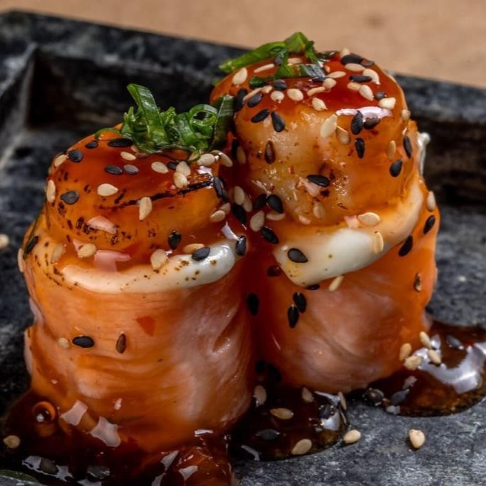 Hot holl aberto, com shari, recheado com salmão grelhado, creme cheese, couve crispy, camarão empanado, cebolinha, gergelim finalizado com molho tarê e molho sweet chilli.