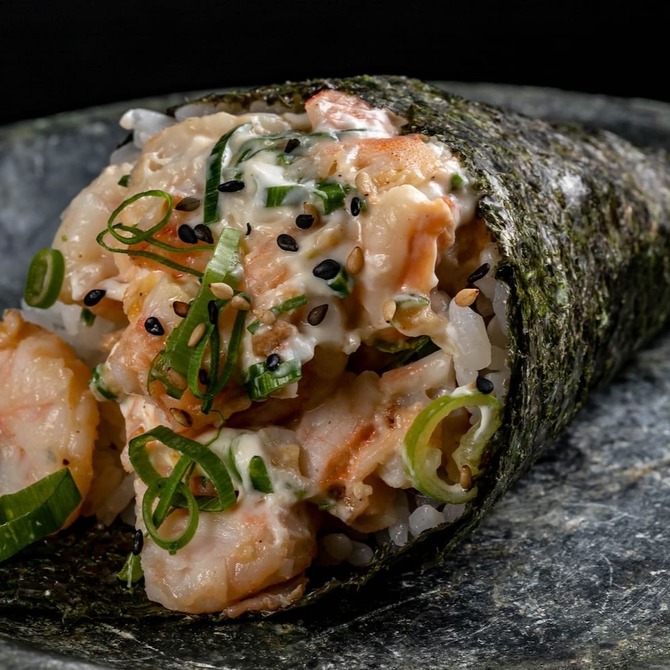 Tradicional kone enrolado com alga marinha, arroz shari, camarão empanado, cebolinha e cream cheese.