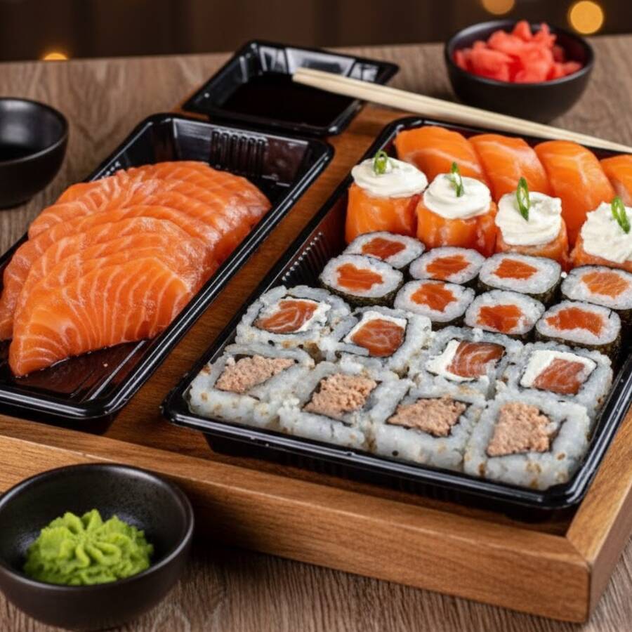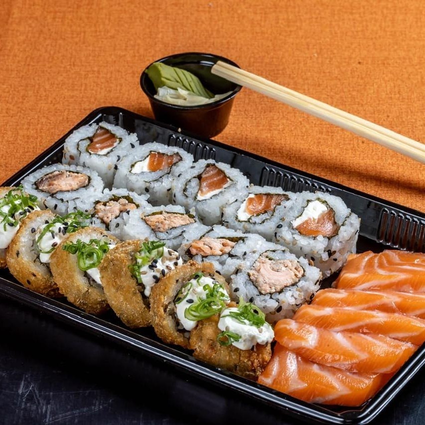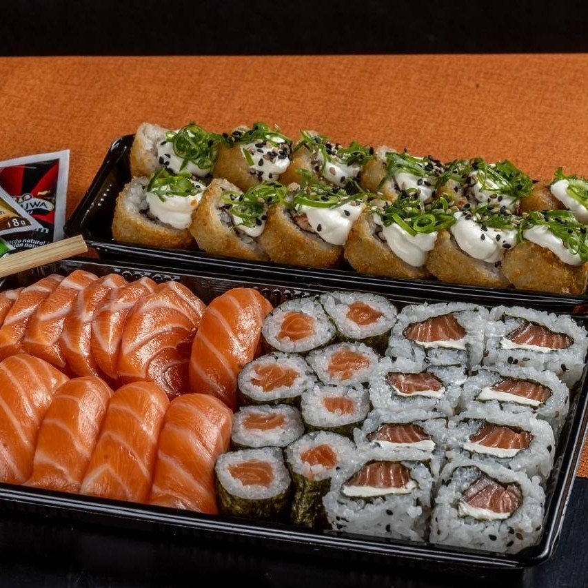 6 sashimis de salmão fresco, 6 niguiris de salmão, 8 sakemaki, 8 ura de salmão cheese e 12 und hot rolls.