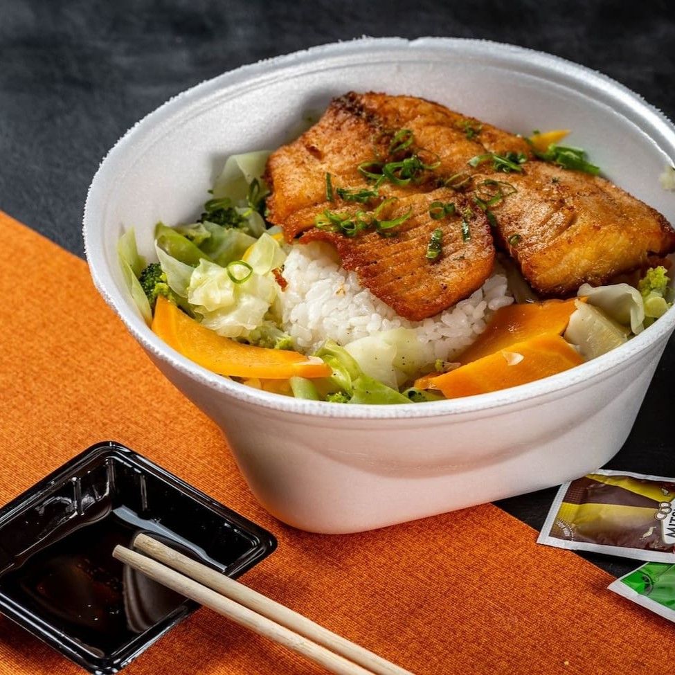 Delicioso Teppan com Arroz + filé de tilapia com legumes salteados.