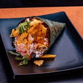 Arroz shari, salmão fresco em cubos com creem cheese, couve crispy, Doritos e cebolinha.