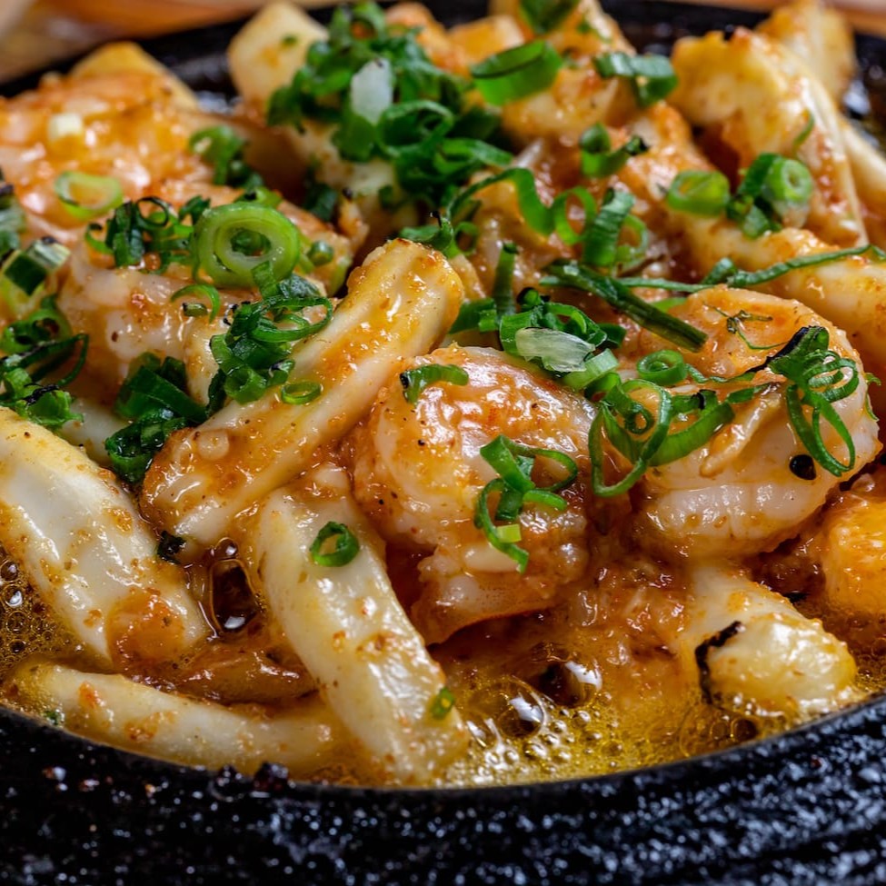 Deliciosa porção de frutos do mar com lula e camarão levemente apimentada temperada na manteiga japonesa batayaki.