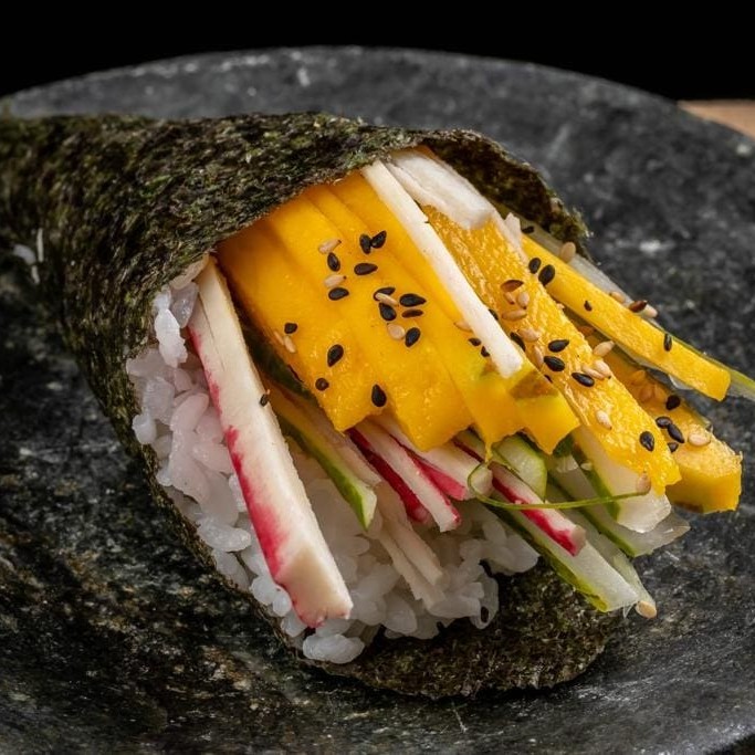 Tradicional kone enrolado com alga marinha + shari + recheio de kani-kama + kiuri +manga.