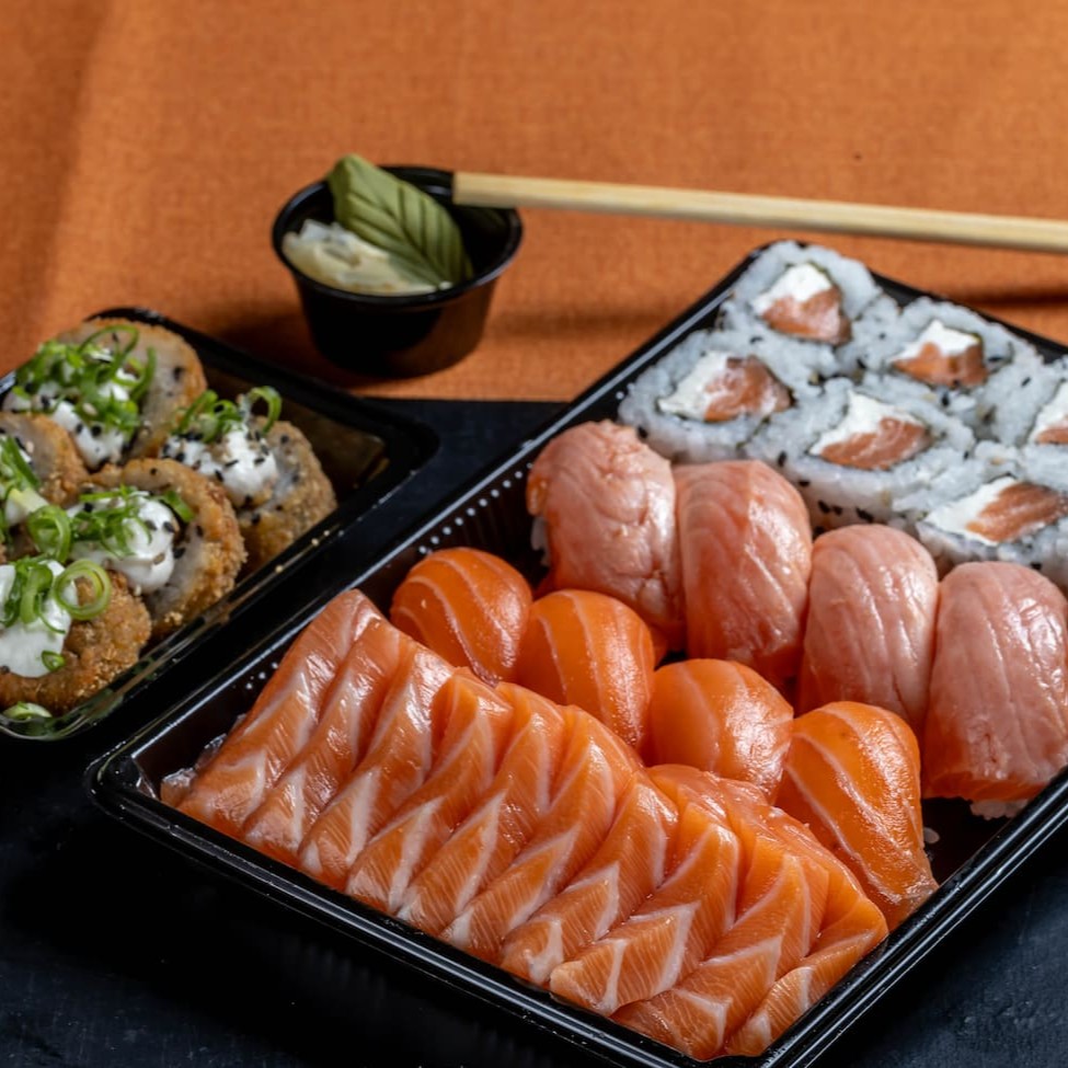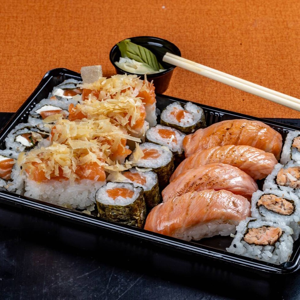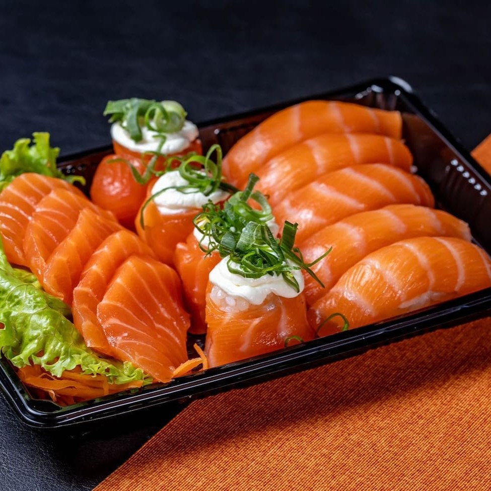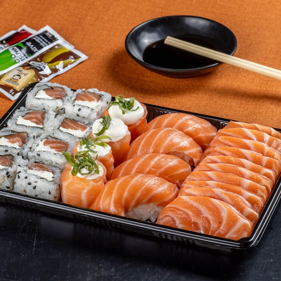 10 fatias de sashimi de salmão fresco, 8 uramaki salmão cheese, 4 niguiris de salmão, 4 niguiris de salmão selados, 5 hot rolls de salmão cheese.