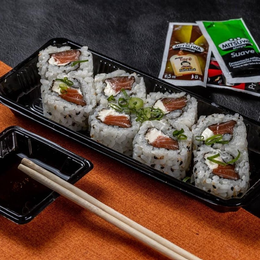 Shari, nori, recheio de salmão, creem cheese e cebolinha.