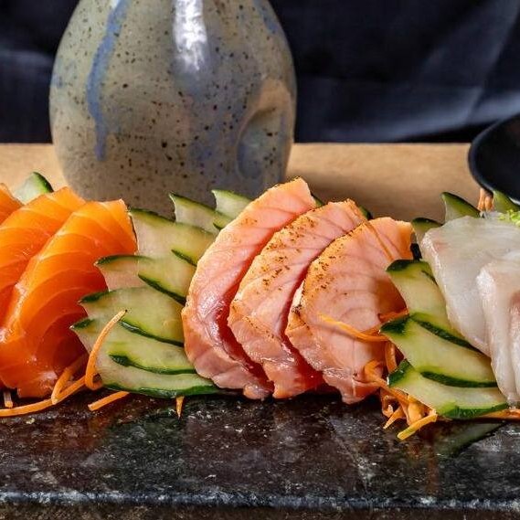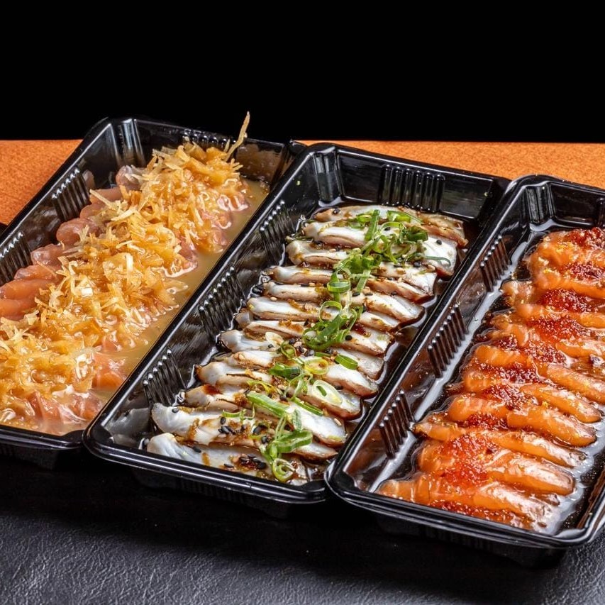 5 sashimis de salmão, 5 uramaki salmão cheese, 5 uramaki salmão grelhado cheese, 5 hot rolls salmão cheese.