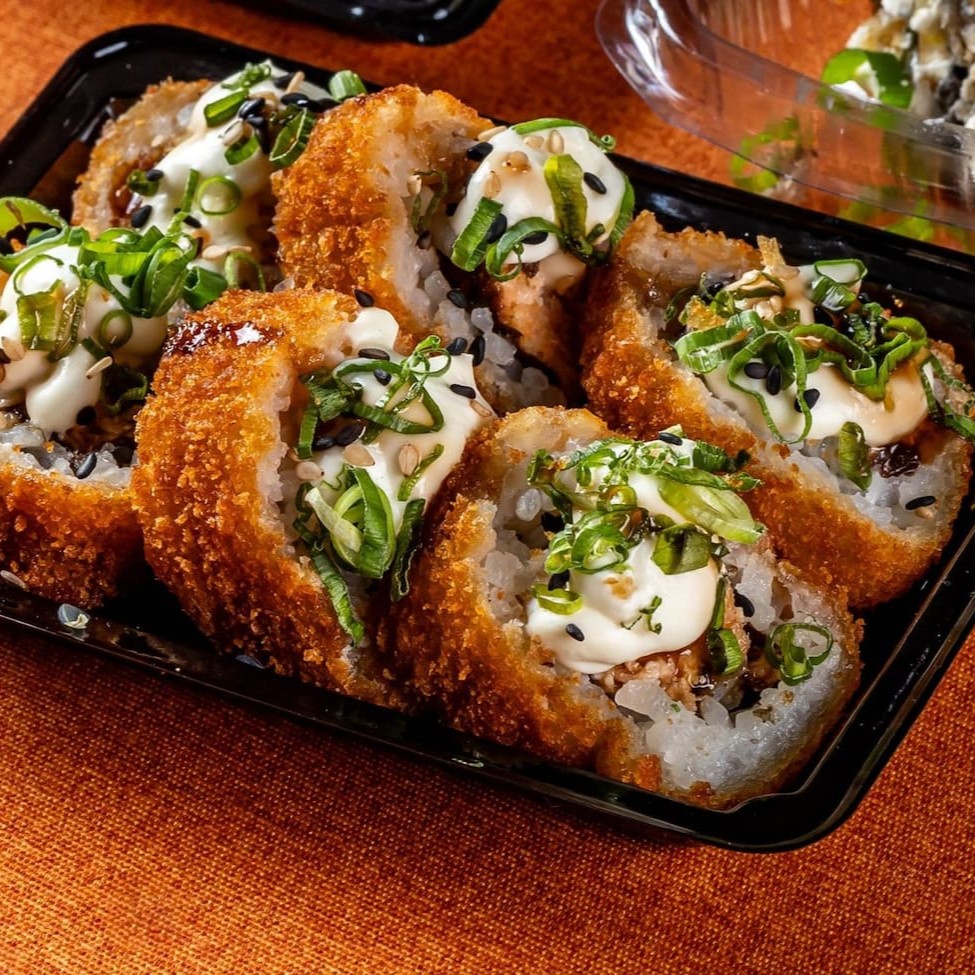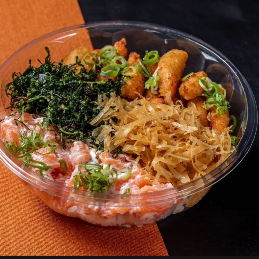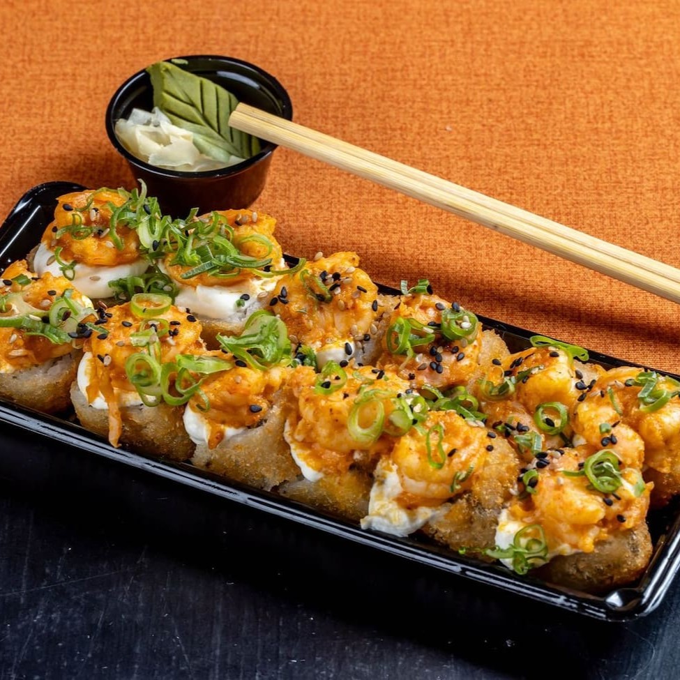 Arroz shari, salmão fresco em cubos com creem cheese, camarão empanado couve crispy, touch crispy e cebolinha.