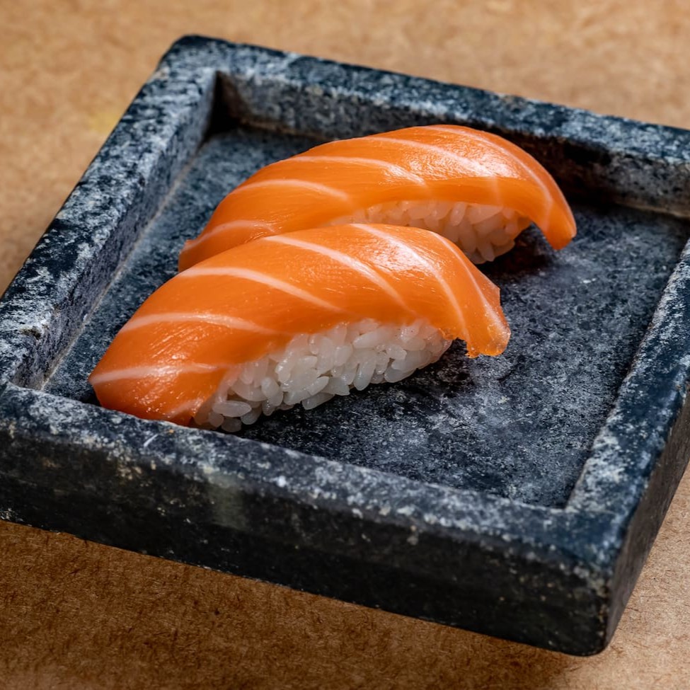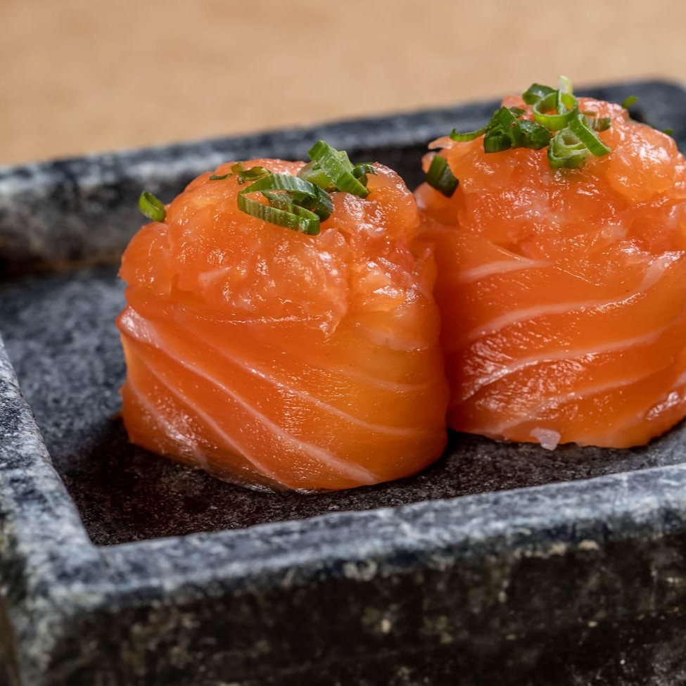 Deliciosa dupla de niguiris com shari + filé de salmão fresco.