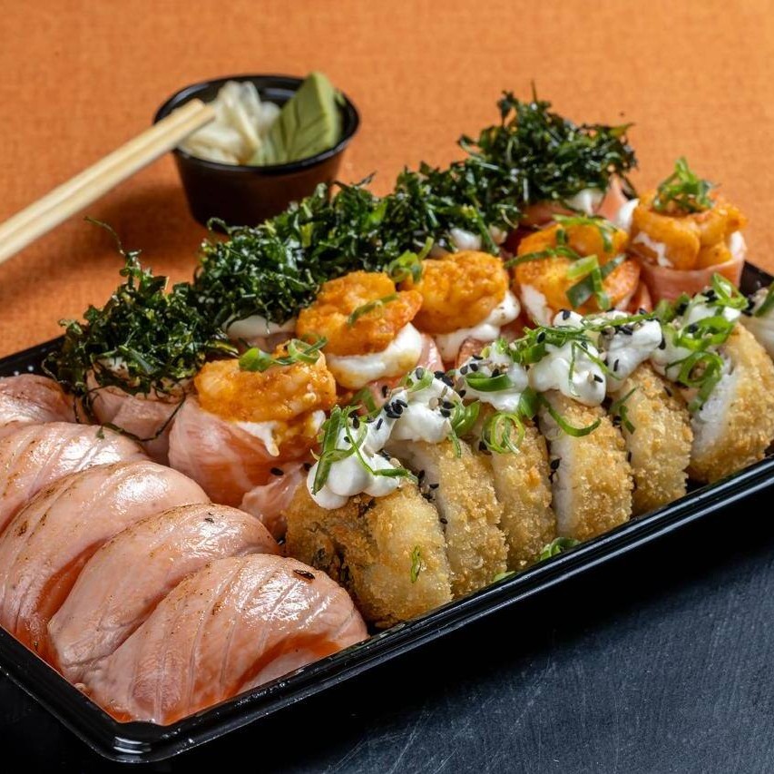 5 djo de salmão com camarão, 5 djo de couve crispy, 5 niguiri de salmão, 5 hot rolls. Combinado selado e finalizado com cebolinha e gergelim.