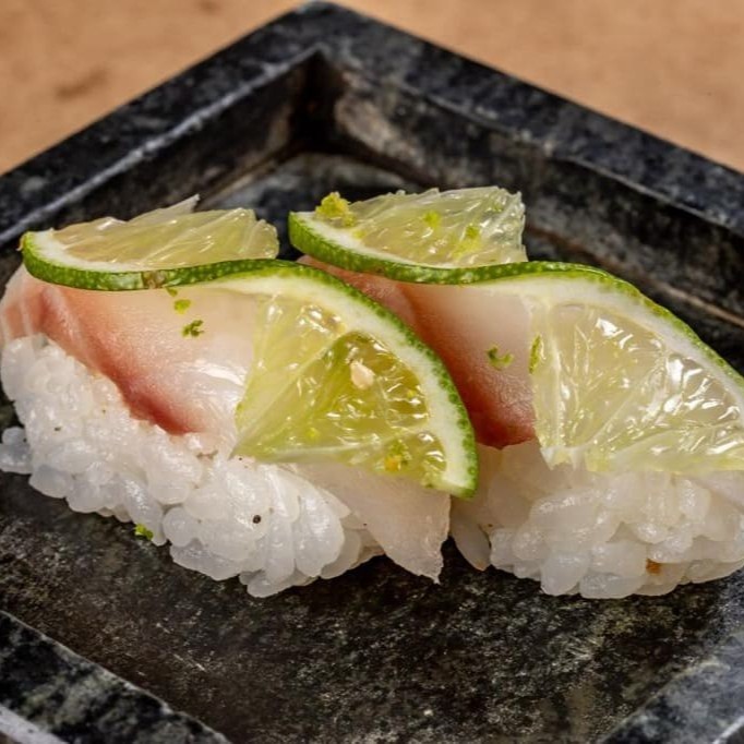 Shari, skin, finalizado com uma fina fatia de limão, gergelim e tarê.