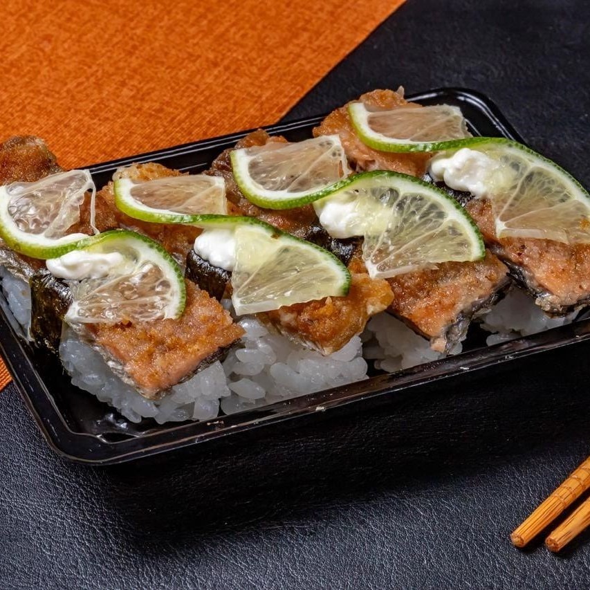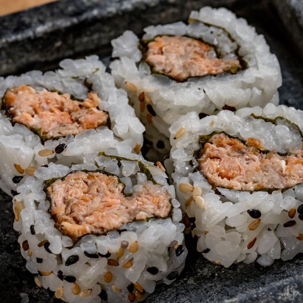 Shari, nori, recheio de salmão grelhado, creem cheese e cebolinha.
