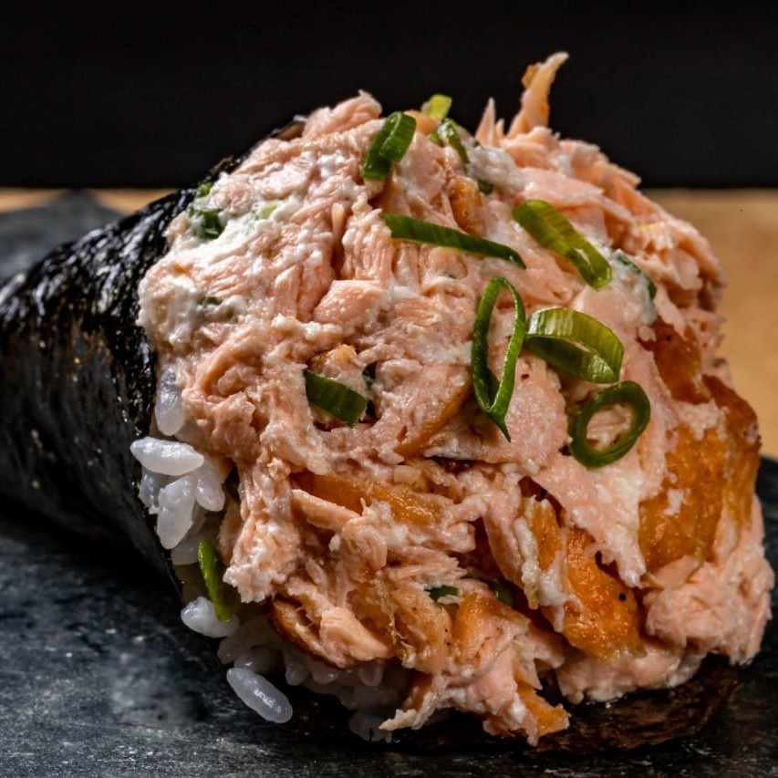 Arroz shari, salmão fresco em cubos com creem cheese, salmão grelhado, couve crispy, touch crispy e cebolinha.