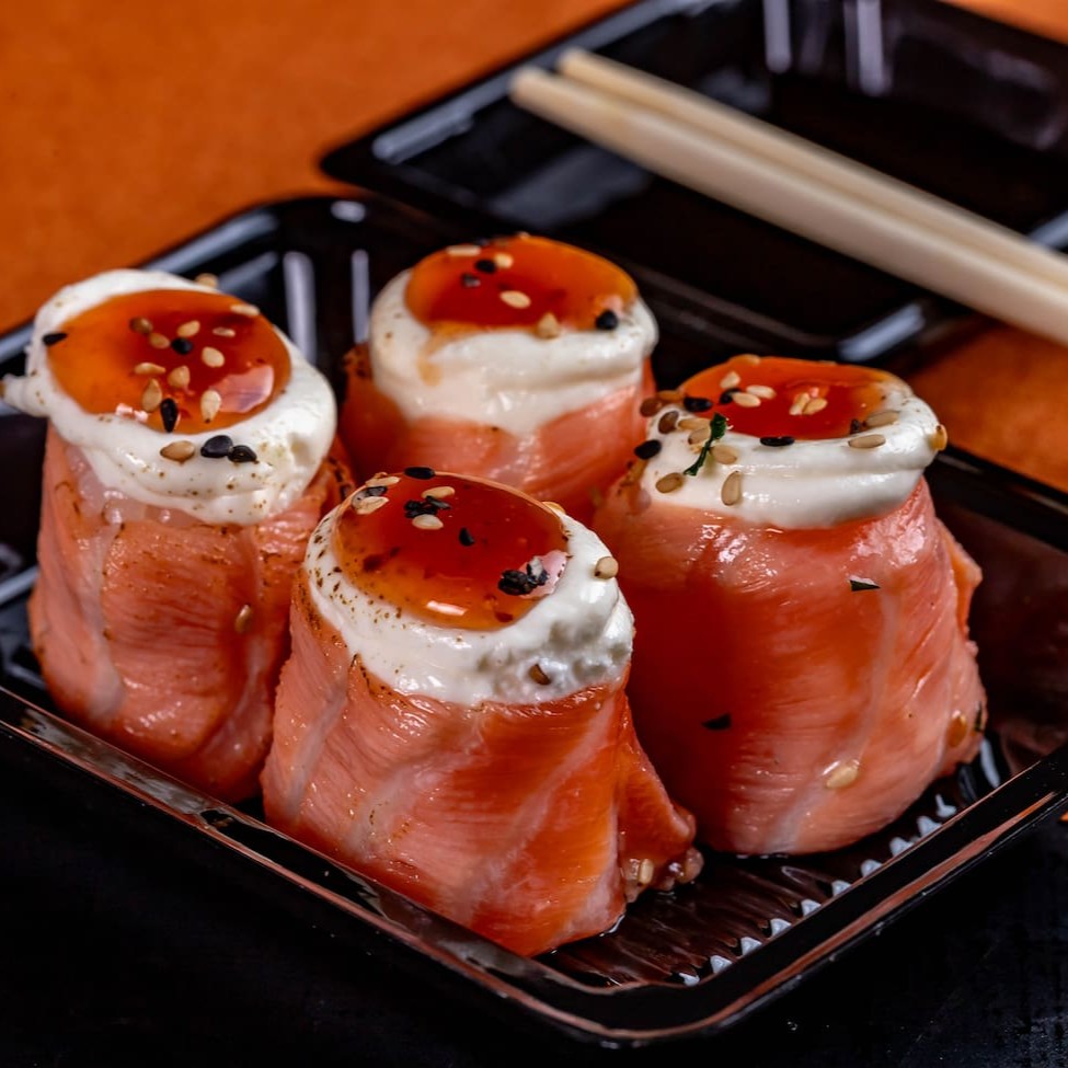 Saboroso Enrolado acompanha; shari +nori+ recheio de salmão grelhado+ cheese+cebolinha.