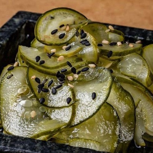 Tradicional pepino japonês fatiado, gergelim e molho Sú ( agridoce ).