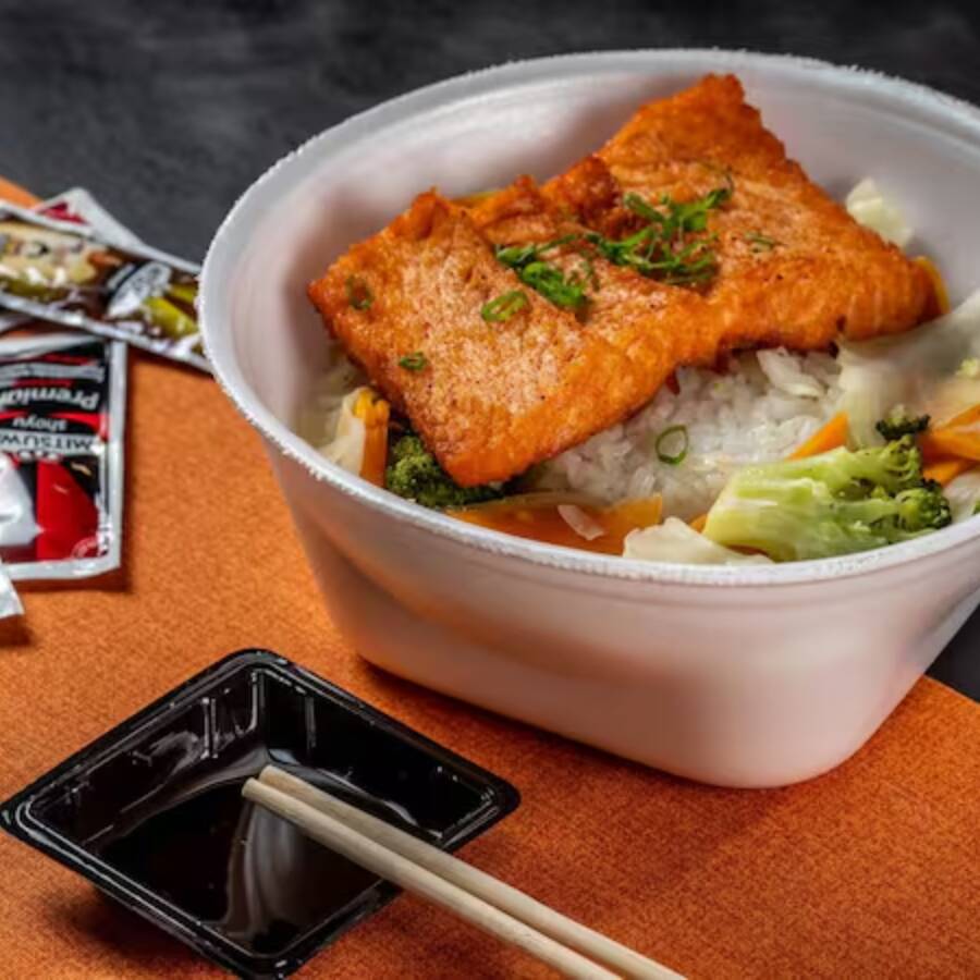 Delicioso teppan com arroz e filé de Salmão com legumes salteados.