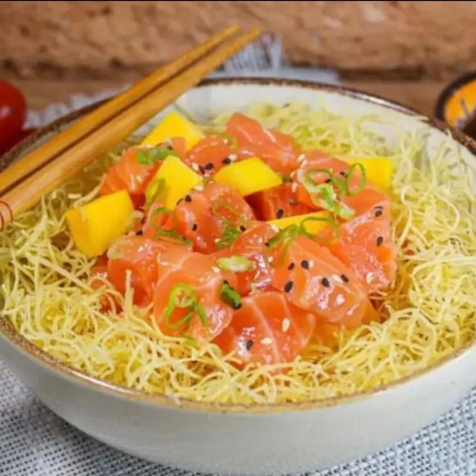 Salmão em cubos temperado com azeite trufado Flor de sal Manga Sunomono Sunomono Cebolinha Batata doce frita Fininha Cebola Rocha Gengilin