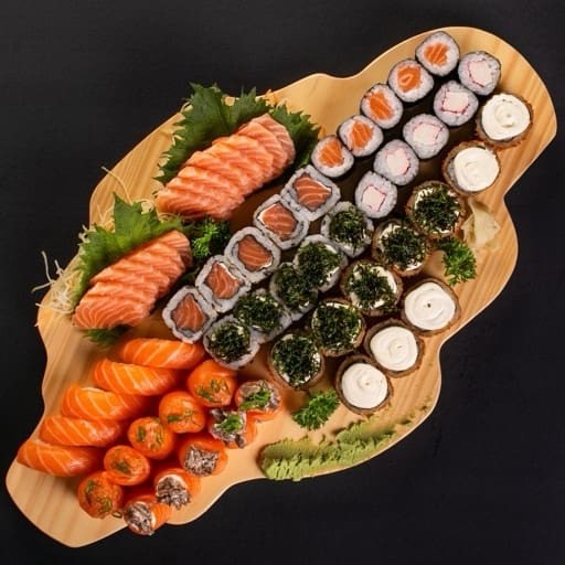 15 sashimis 5 niguiri salmão 5 jyo shimeji 5 jyo de salmão 5 uramaki salmão 5 hossomaki de kani 5 uramaki skin com couve 5 hot holl 5 hot holl com couve 5 hossomaki salmão