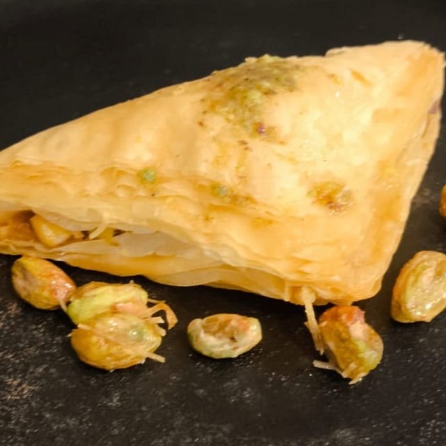 Folhado com pistache fresquinho coberto com calda de açúcar. Um mergulho na árabia a casa mordida!!