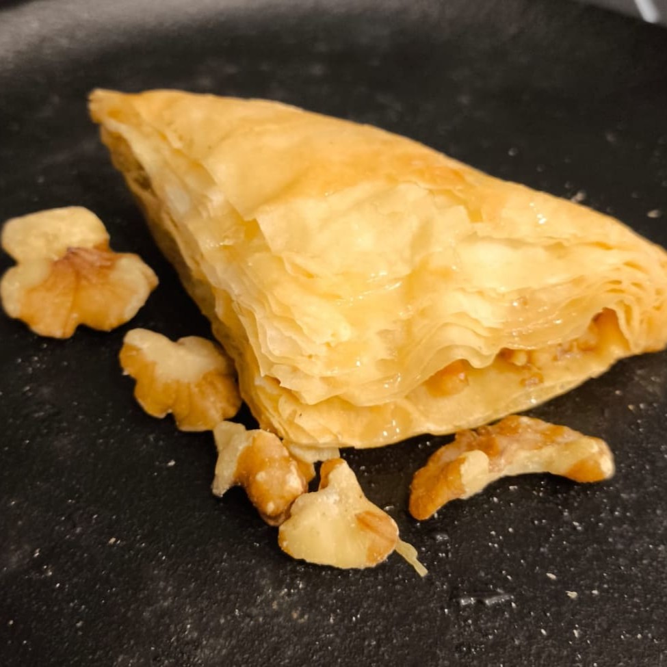 Massa folhada com nozes fesquinhas e uma calda de açucar em sua cobertura. Um mergulho nas árabias a cada mordida!