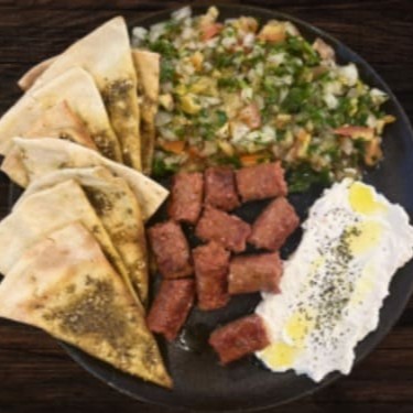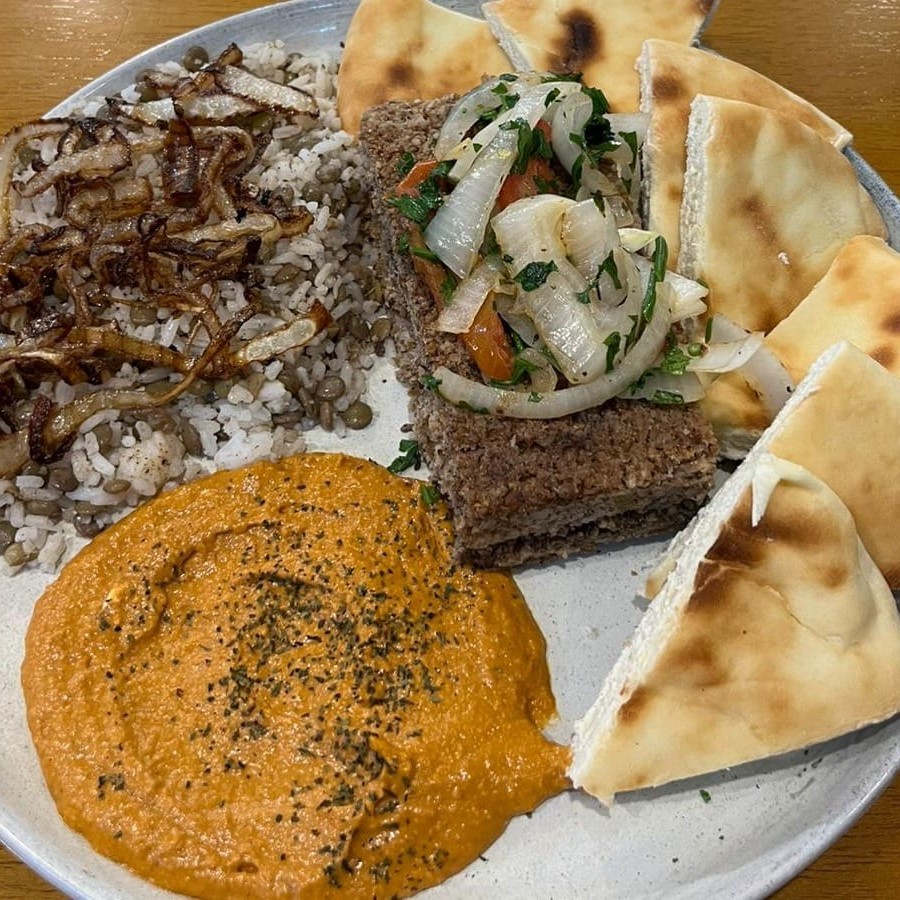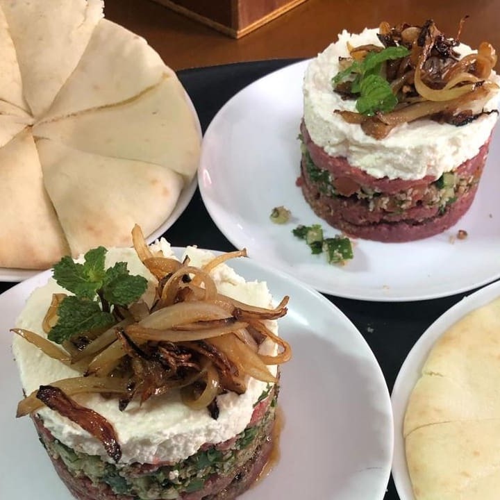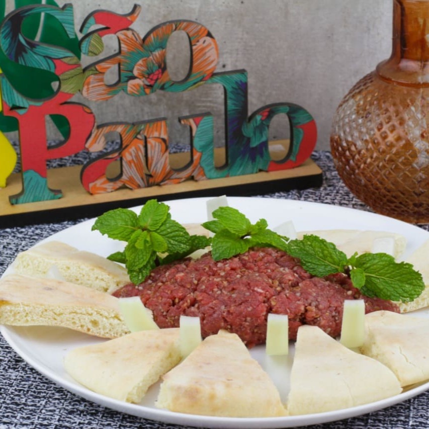 Porção de kibe cru temperado com especiarias árabes, finalizado com hortelã e acompanhado por pão sírio.