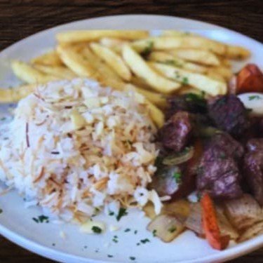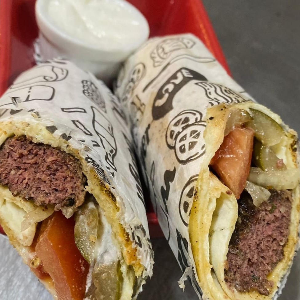 Delicada kafta grelhada na chapa com za'atar, envolta em pão árabe fresco junto com cebola caramelizada, tomate e picles. Acompanha irresistível pasta de alho cremosa.