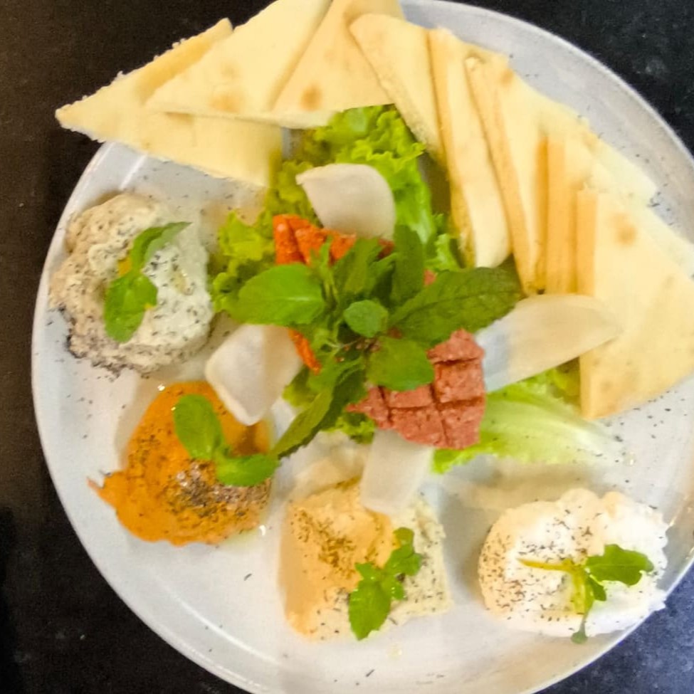 2 pastas a sua escolha (coalhada, tabule, banaganush, muhamara, hommus ) 1 pão sírio caseiro 2 kaftas 1 porção de arroz cabelinho de anjo 1 esfiha carne 1 esfiha queijo 1 kibe - Desfruta de uma verdadeira experiência Gourmet no conforto da sua casa!