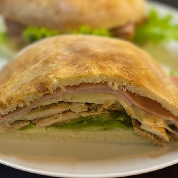 Camadas generosas de frango temperado e queijo derretido, combinadas com presunto, ovo frito, alface fresca, tomate e um toque de maionese. Prensado no pão sírio até ficar dourado e crocante.