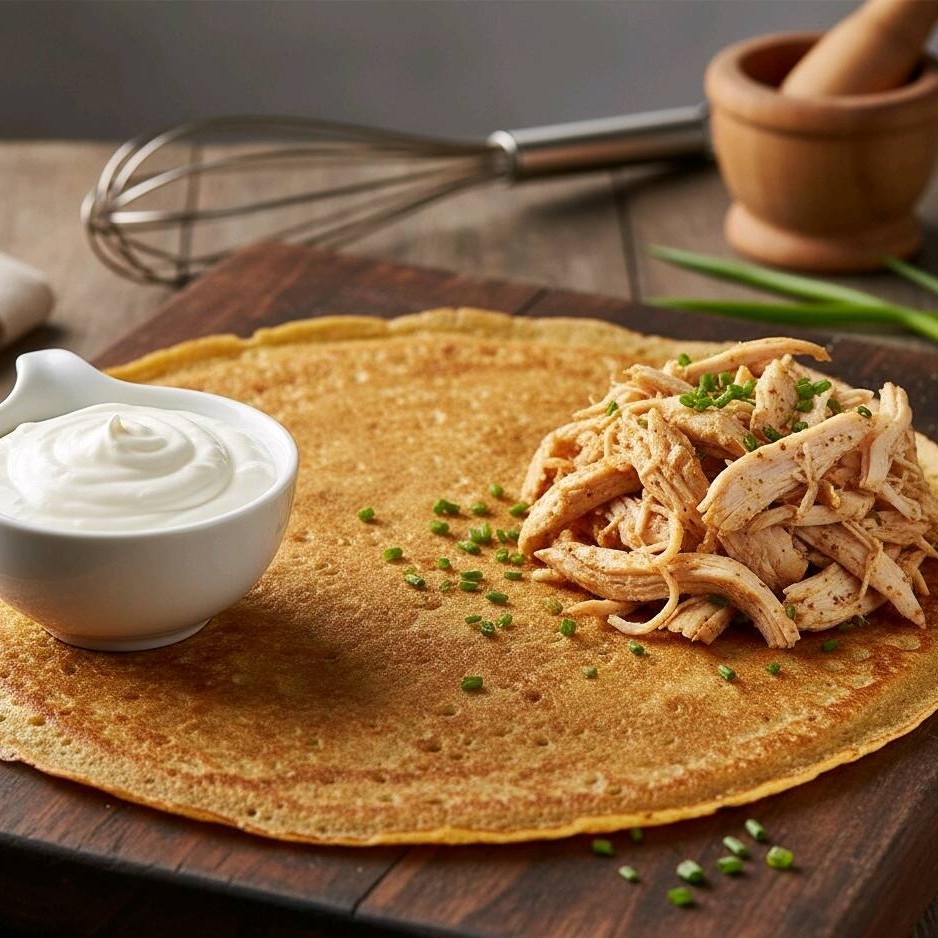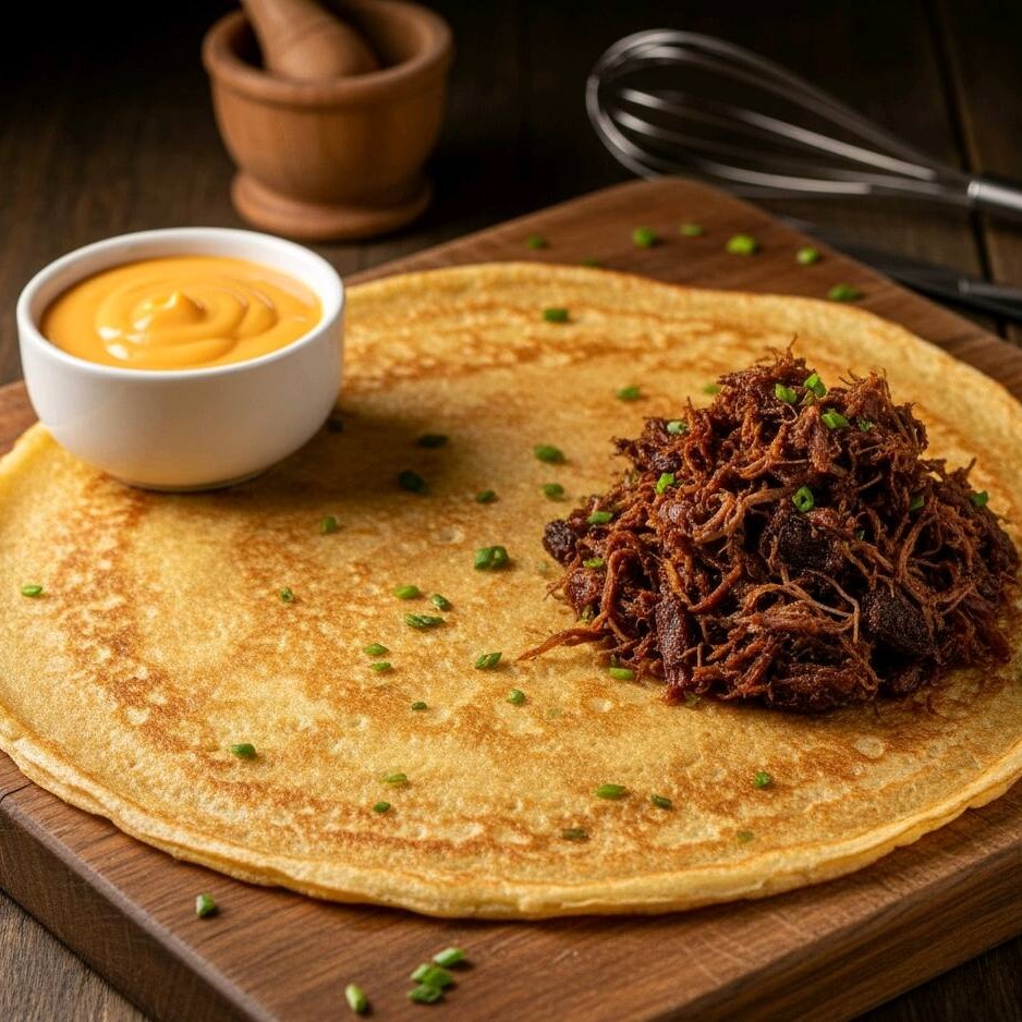 Um crepe robusto e cheio de personalidade. A potência da Carne Seca desfiada e saborosa é suavizada pela cremosidade e textura puxa-puxa do Queijo derretido. É o conforto da comida caseira com a elegância do crepe.