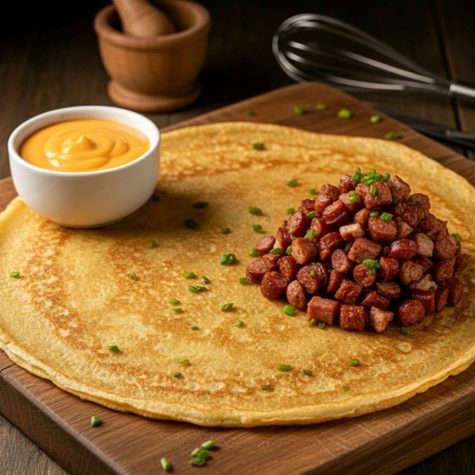 Para os amantes de sabores fortes. Saboreie o nosso crepe recheado com Linguiça Calabresa de primeira, cuidadosamente picada, e uma generosa porção de Requeijão de alta qualidade. Uma experiência de sabor intenso e inesquecível.