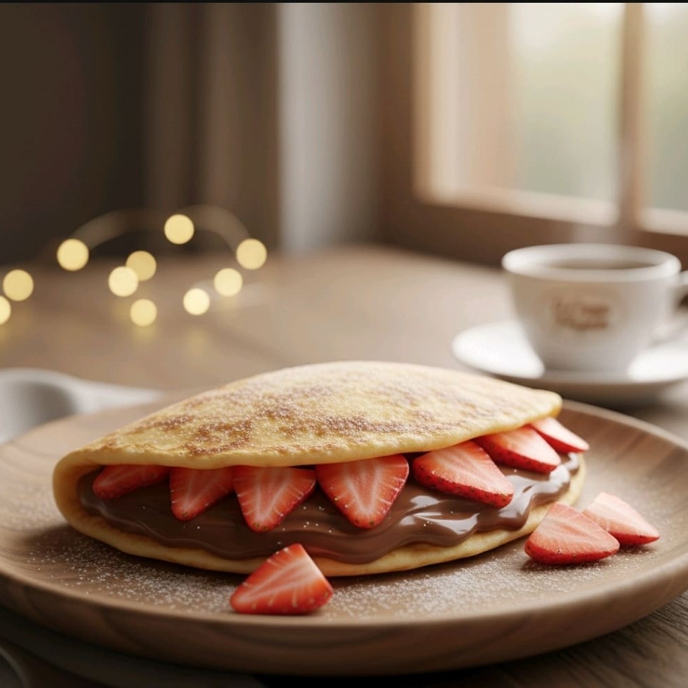 Um crepe que abraça! A combinação confortante e caseira de rodelas de banana caramelizada, finalizada com uma pitada quente de canela e açúcar. Ideal para quem ama sabores quentes e doces.
