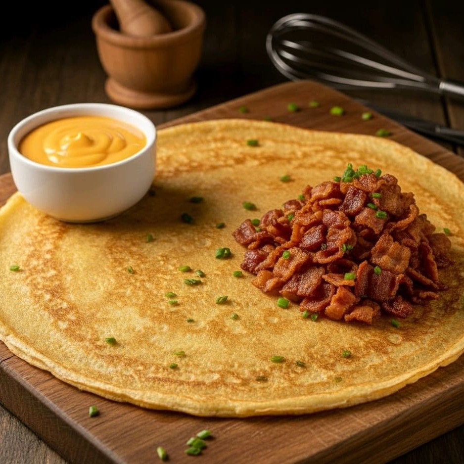 """O clássico que nunca erra. Bacon frito até o ponto de crocância perfeita (o 'Crispy'), combinadas com a riqueza e o sabor do nosso Cheddar Melt derretido (o 'Gold'). O contraste entre o salgado, o crocante e o cremoso torna este crepe pura indulgência. É impossível comer um só!"""