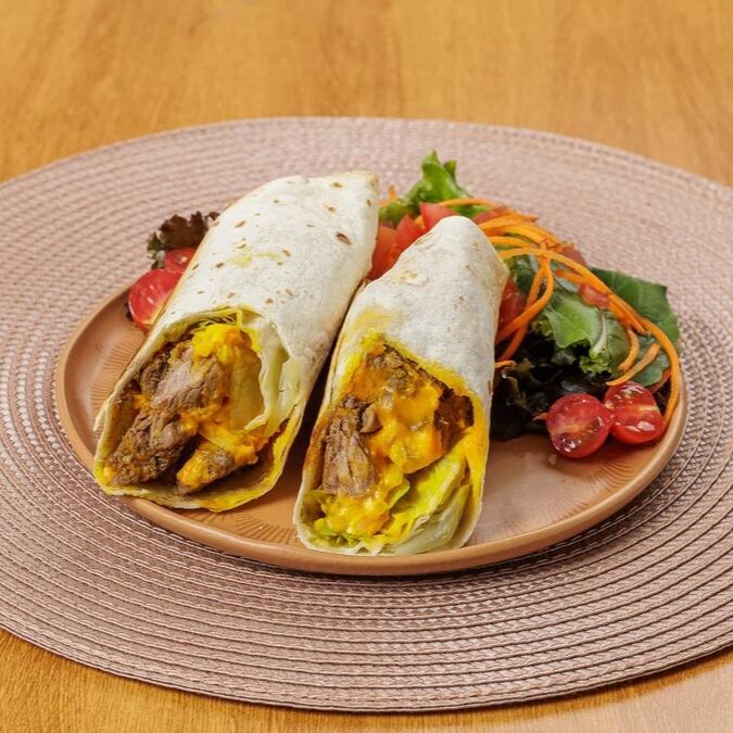 Massa síria, produção artesanal, leve e fresca Filé mignon, cheddar, cebola caramelizada e alface americana