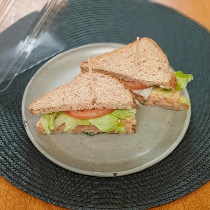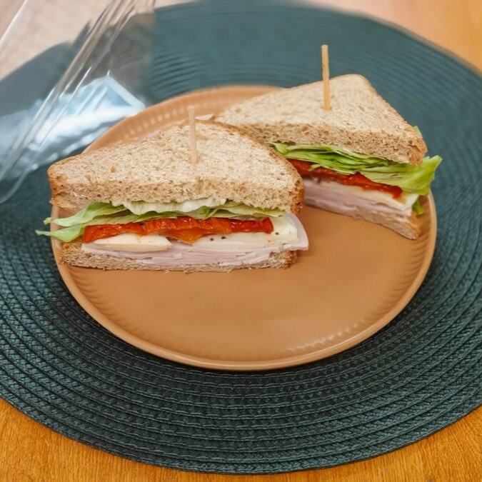 Pão de forma integral, peito de peru, queijo branco, tomate seco e alface