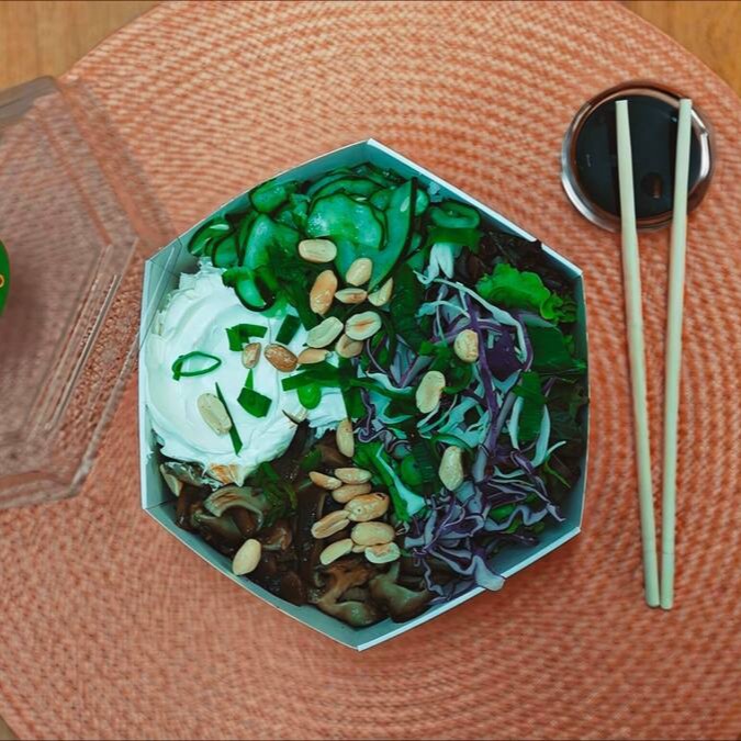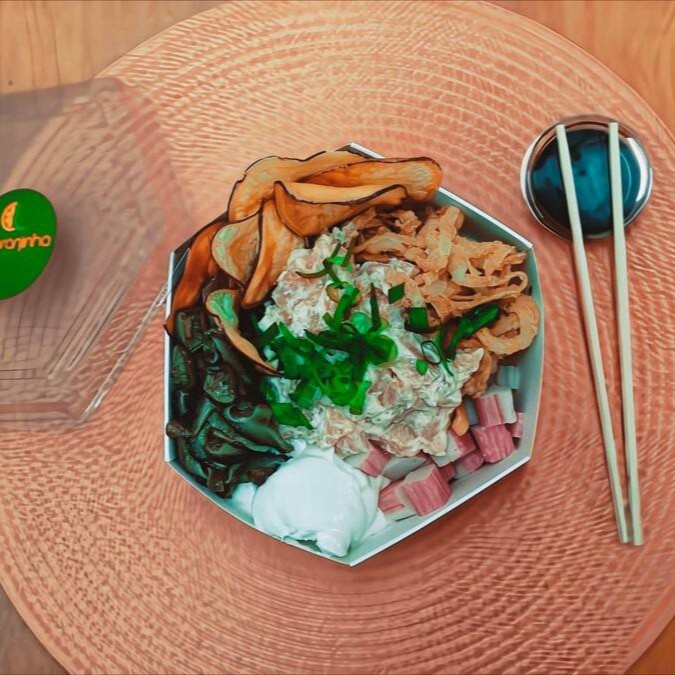 Arroz japonês shimeji mix de folhas, sunomomo, cream cheese, chips de batata doce, repolho colorido, amendoim.