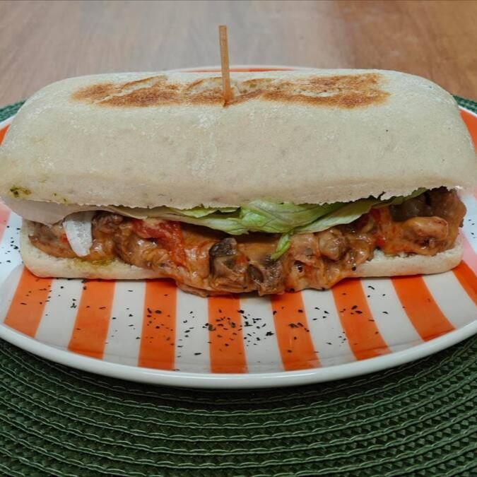 Delicioso pão ciabata, regado com molho pesto, recheado com o saboroso filé mignon marinado, com queijo mussarela e prato e alface americana
