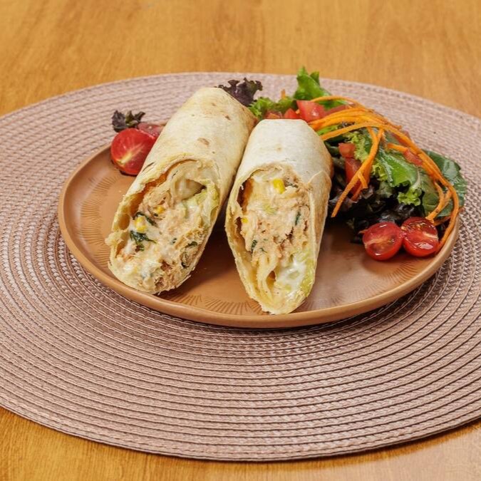 Massa síria produção artesanal leve e fresca ,Frango desfiado, Catupiry, milho e alface americana