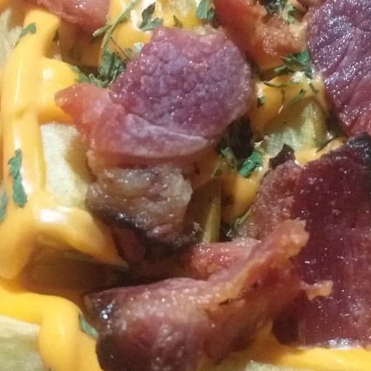 350 grs de Batatas rústicas fritas, cobertas com cheddar e salpicadas de bacon.......pode até servir 2 pessoas