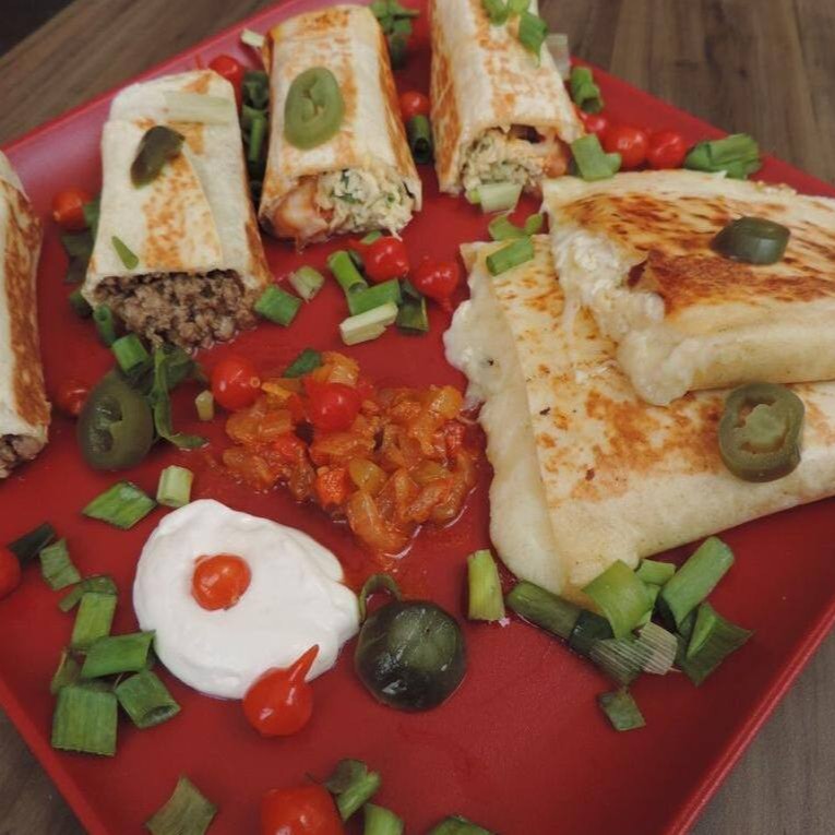 Tortilla de trigo fininha e levemente tostada, enrolada e recheada com delícias típicas Mexicanas. Montado com escarola, queijo prato, salsa Mexicana, guacamole e sour cream.